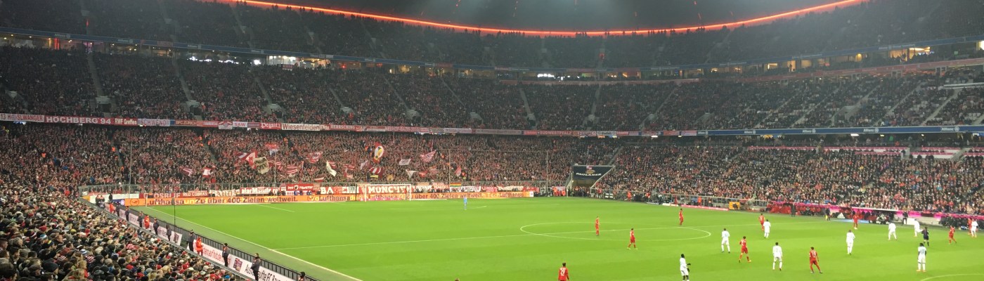 Wo die Anfahrt zum Stadion nur von der ungewohnt grellen, mir ja ohnehin fremden Primärfarbe des lokalen Großvereins dominiert werden sollte und abseits dieser Ungewohntheit keinerlei Auffälligkeiten darstellte, erwies sich der Weg von der U-Bahn zur Einlasskontrolle als erste Begegnung mit dem Unbekannten. Die letzten hundert Meter wurden zum Spießroutenlauf zwischen selfieschießenden Touristen- und Stadionerstbesuchern hindurch. Menschen, die sich gegenseitig eingehakt aufbauten, mussten ihren abendlichen Ausflug für die Nachwelt festhalten – oder, was wahrscheinlicher ist, für die Weiterreichung auf sozialen Kanälen. Man fühlte sich etwas an eine Preisverleihung erinnert, bei der die Wege der Stars und Sternchen aus allen erdenklichen Winkeln von Fotografen festgehalten werden. Lauschte man kurz den beschwingten Kommandos der freudig grinsenden Bildmotive, konnte man eine Vielzahl verschiedener Sprachen ausmachen. Die Besucherschar schien äußerst international zusammengestellt zu sein. Unterstützt wurde dieser Eindruck von mehreren asiatischen Gruppen, die anscheinend im Kollektiv mit identischen Fanutensilien ausgestattet wurden: Baseballkappe und Schal. Mir wurde in diesen Momenten noch vor dem ersten Betreten des eigentlichen Stadiongeländes klar, dass eine nicht unwesentliche Teilmenge der Bayern Fans an diesem Abend ihren Premierenbesuch im Münchner Fußballtempel feiern sollte. Unterstützt wurde dieser Eindruck von der auffallend dichten Präsenz roter Fanshop Tüten. Nun muss natürlich nicht hinlänglich jeder Tütenträger das erste Mal einen Fuß in das Stadion setzen, aber es kauft sicherlich nicht jedermann alle zwei Wochen neue Artikel im Fanshop ein. Ein beträchtlicher Teil des Systems FCB ist auf Konsum und Vermarktung ausgelegt. Und das spürt man. Seien es die Fotofans, die Tüten oder die aufdringliche magentafarbene Aufforderung zur Benutzung des kostenlosen Stadion-WLAN, um mit Lichtgeschwindigkeit die Bayern-App durchforsten zu können.